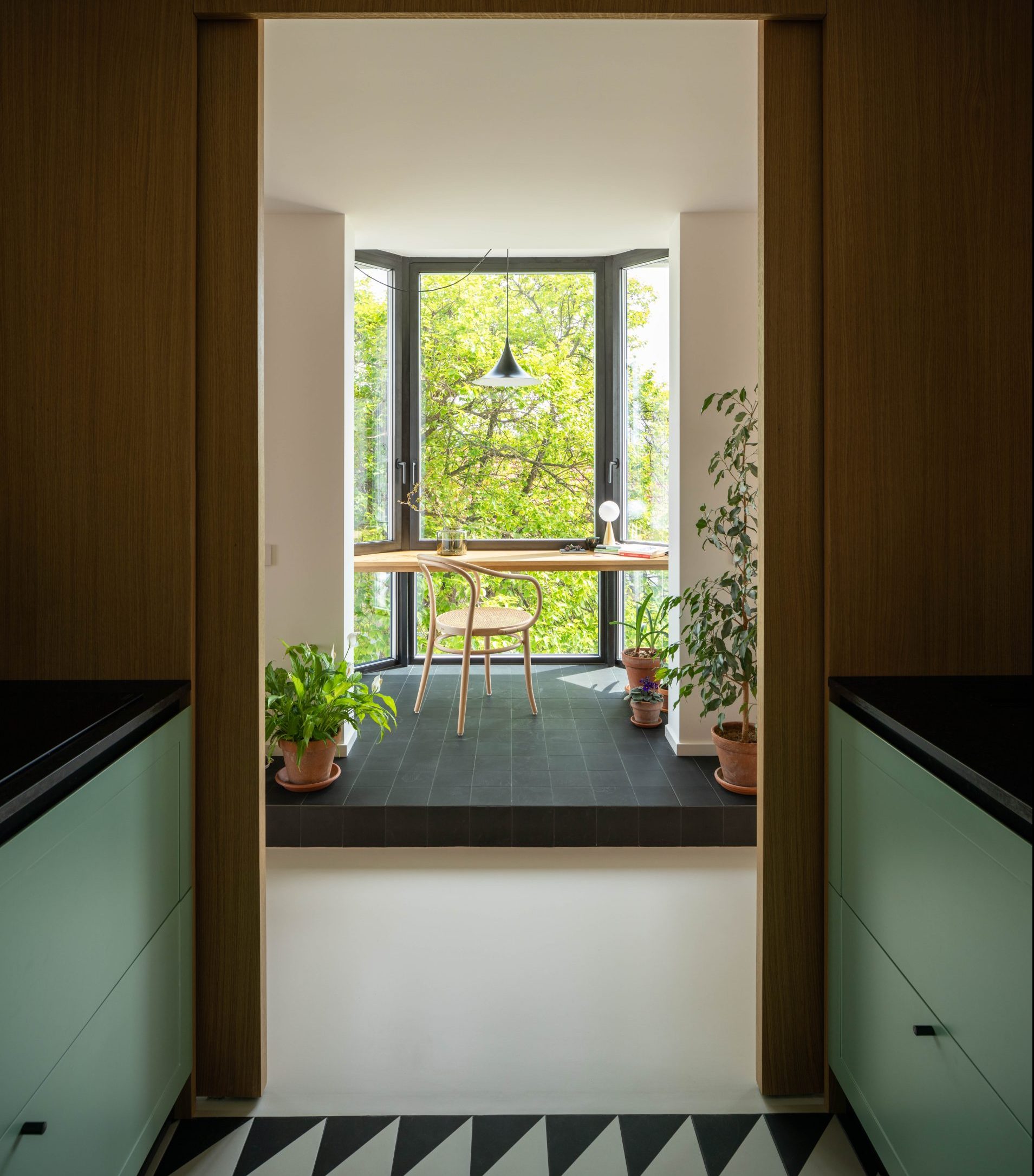 "Altro tema che ha guidato la ristrutturazione è la presenza del verde che si addentra nella casa attraverso le grandi finestre a sud e il bow-window (GALLERY QUI SOTTO) realizzato al posto di un balcone preesistente ed ora spazio contemplativo dentro al quale ci si sente come in una casetta sull’albero, completamente immersi nella chioma del grande albero di cachi che ne lambisce le vetrate. Uno spazio minimo che grazie ad un attento disegno dei dettagli ed una paziente cura nella scelta dei materiali, diventa un ambiente di grande valore a dispetto dei suoi pochissimi metri quadri".