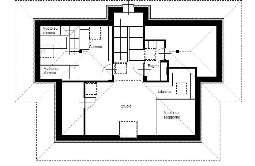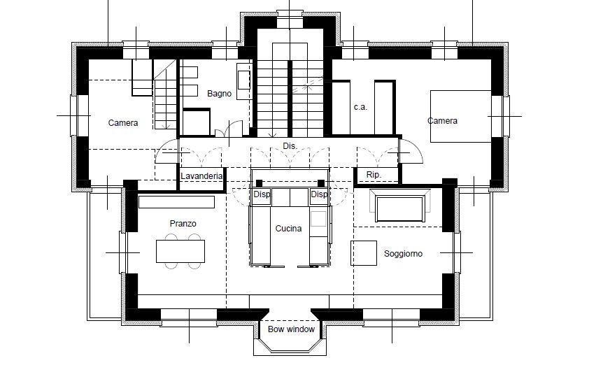 L'open space della zona giorno con la cucina si trova al primo piano della casa affacciandosi lungo il prospetto principale, aperto con due finestre e un bow-window centrale. Per capire come è stato sviluppato l'intero progetto, abbiamo chiesto all'architetto Bosio come fosse in origine la casa e, quindi, quale fosse l'idea generale per la ristrutturazione. "La casa era disabitata da molti anni ed era ricca di dettagli tipici della metà del secolo scorso e, così, abbiamo cominciato a ragionare su una possibile ristrutturazione che parlasse quel linguaggio. I lavori di ristrutturazione hanno coinvolto l’intera casa, compreso il recupero del sottotetto, e sono stati finalizzati a realizzare una distribuzione non convenzionale degli spazi", ha detto Claudio Bosio.