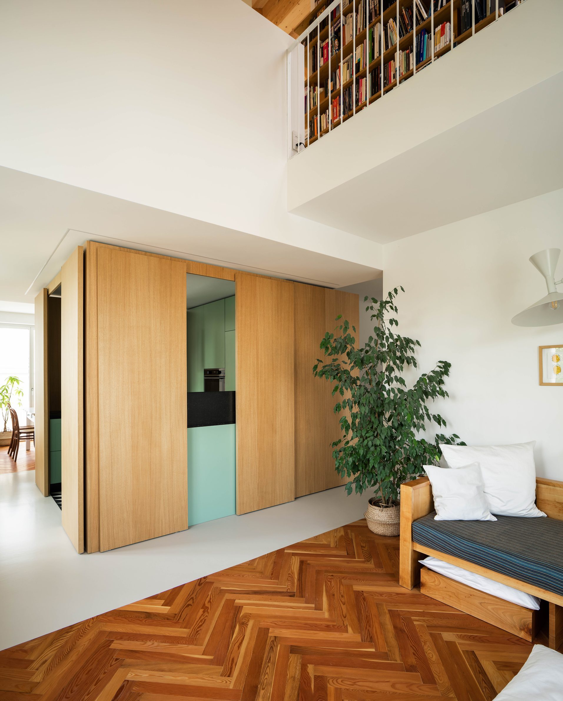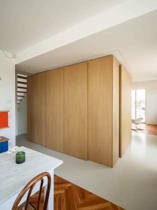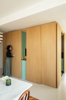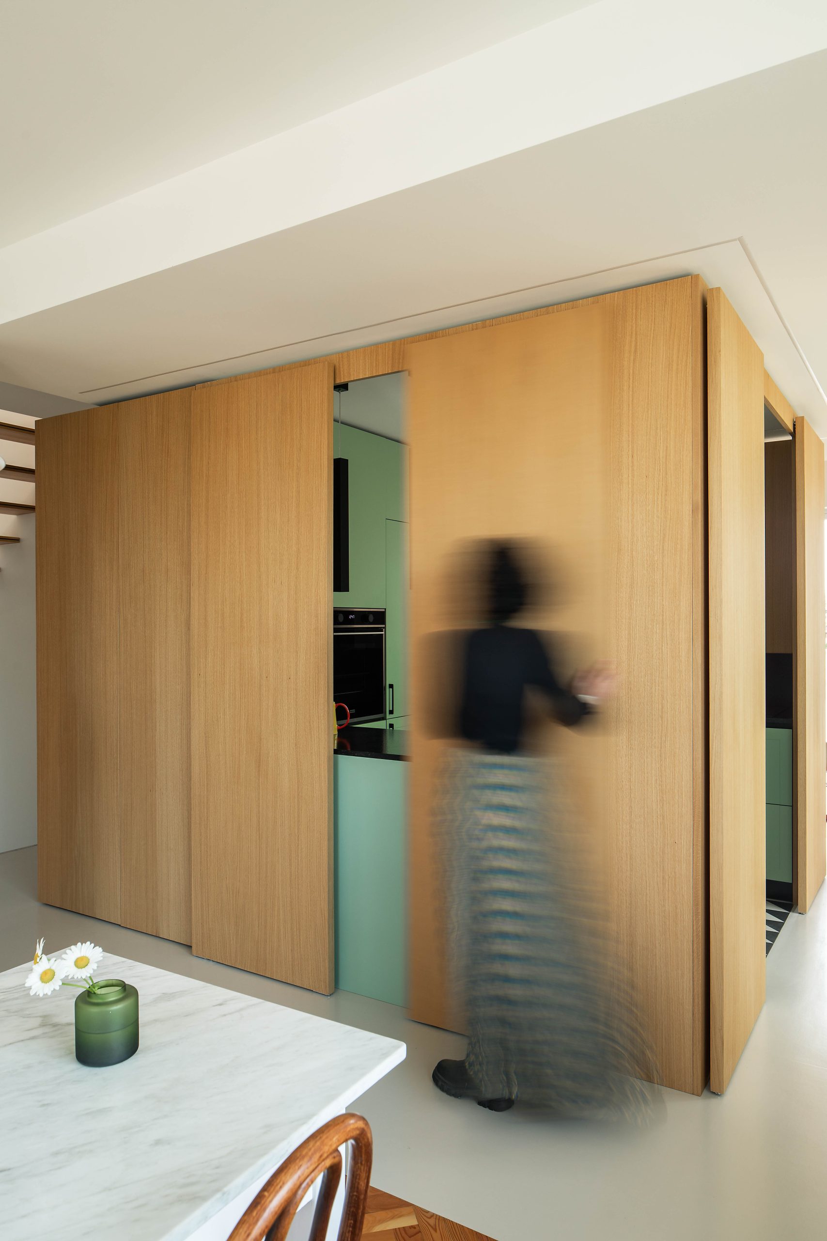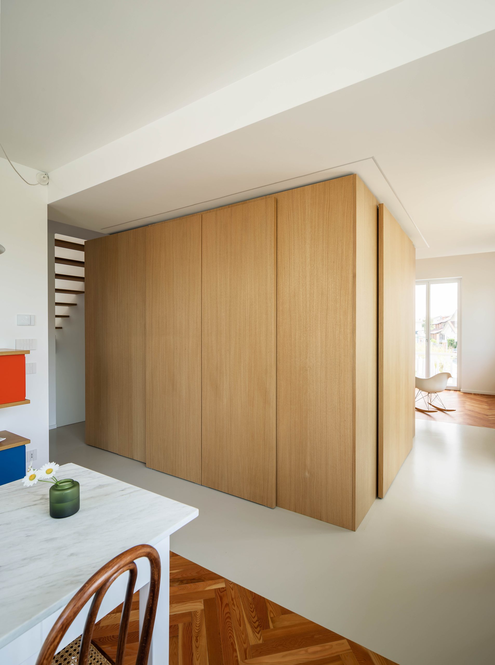 Un'idea originale e di forte resa estetica, dunque, quella di creare un blocco-cucina richiudibile e indipendente. "La cucina è un ambito funzionalmente separato dal resto del living, ed è richiudibile quando necessario", continua l'architetto Bosio. "Quando però le ante della scatola si aprono, l’effetto è quello di una cucina ad isola, strettamente in relazione con l'area pranzo da un lato e il soggiorno dall’altro". Posto esattamente al centro della zona giorno, il cubo che contiene la cucina è costituito da pareti e da ante scorrevoli che arrivano al soffino realizzate in legno di rovere; è circumnavigabile e rappresenta anche un elemento di partizione/connessione spaziale.