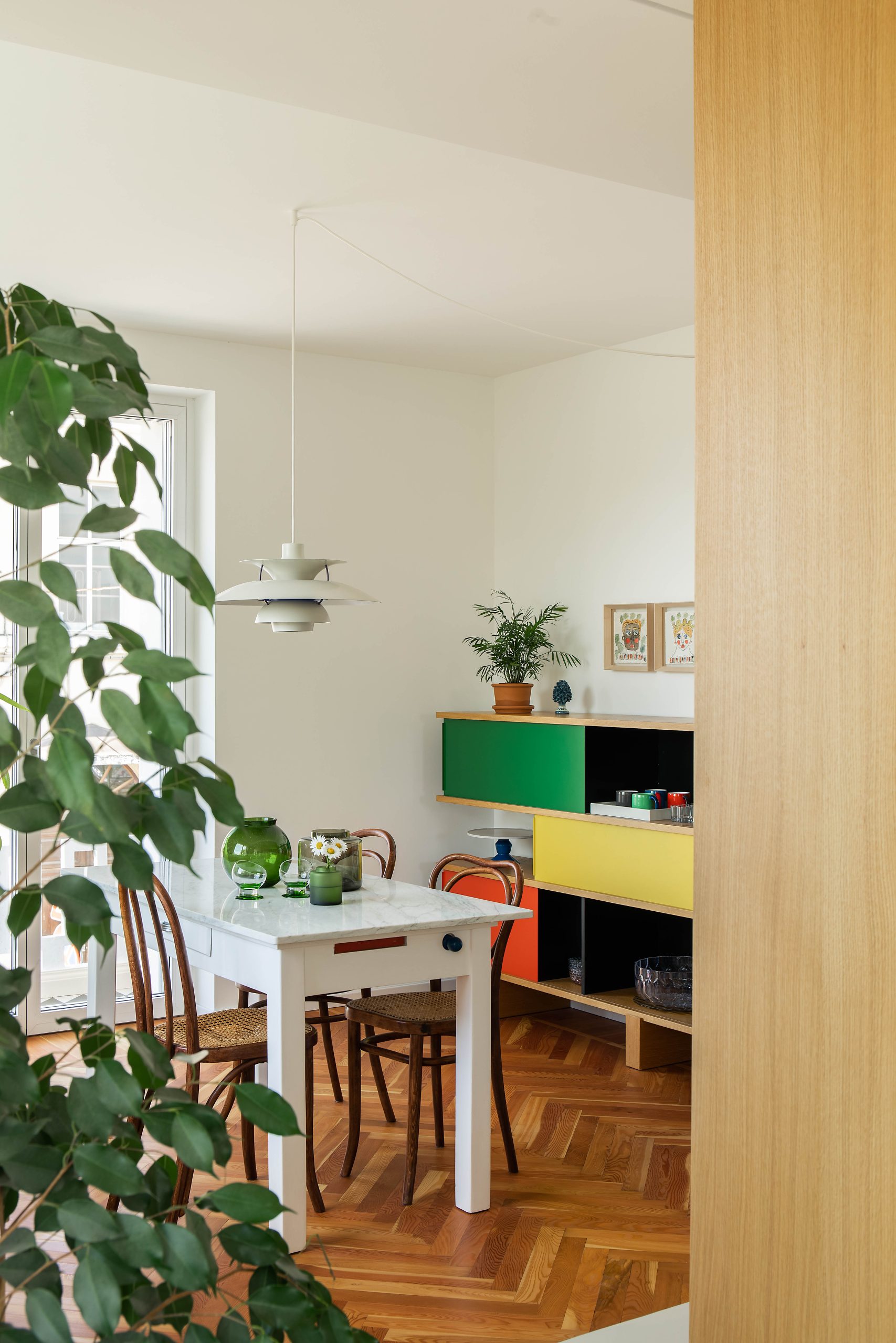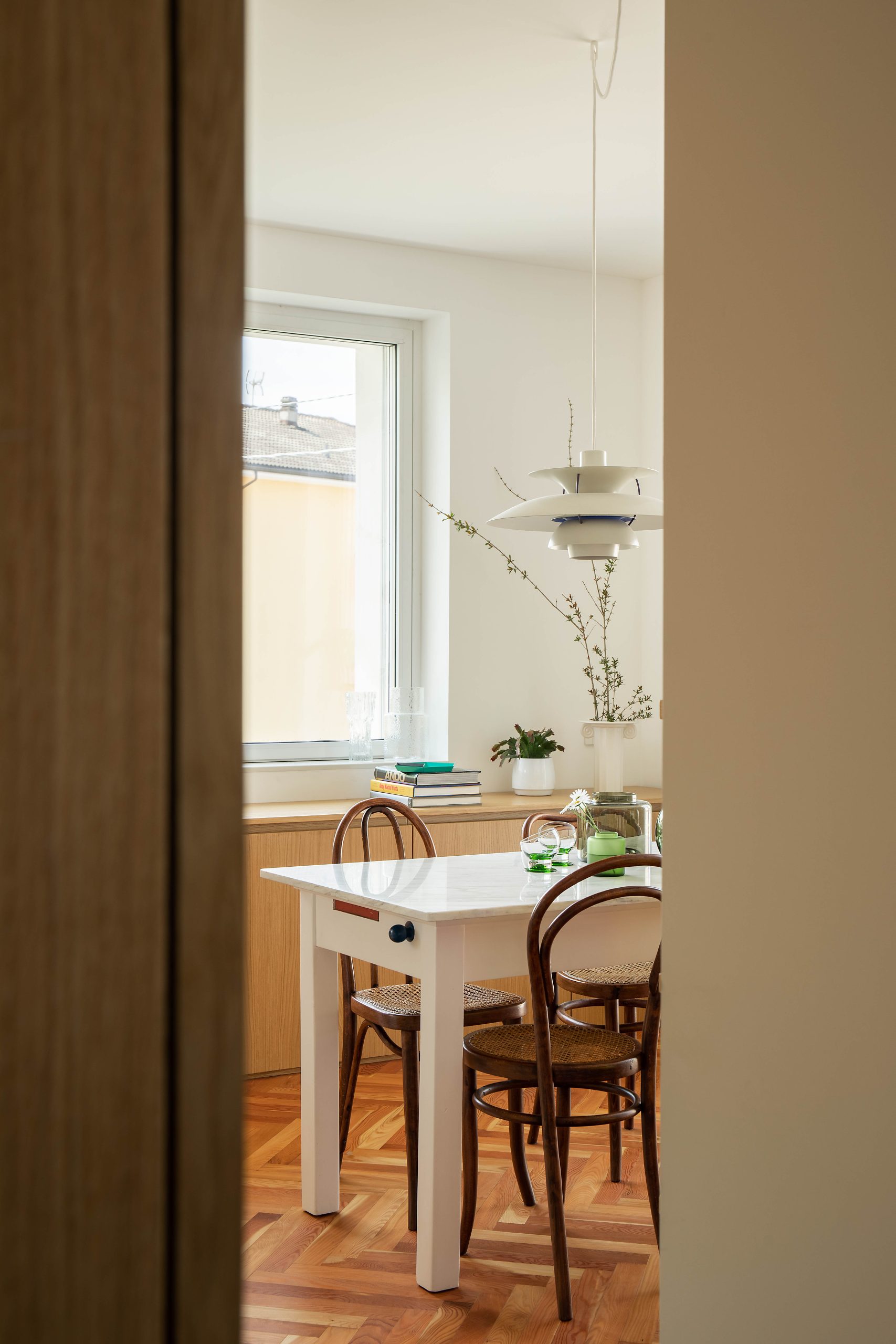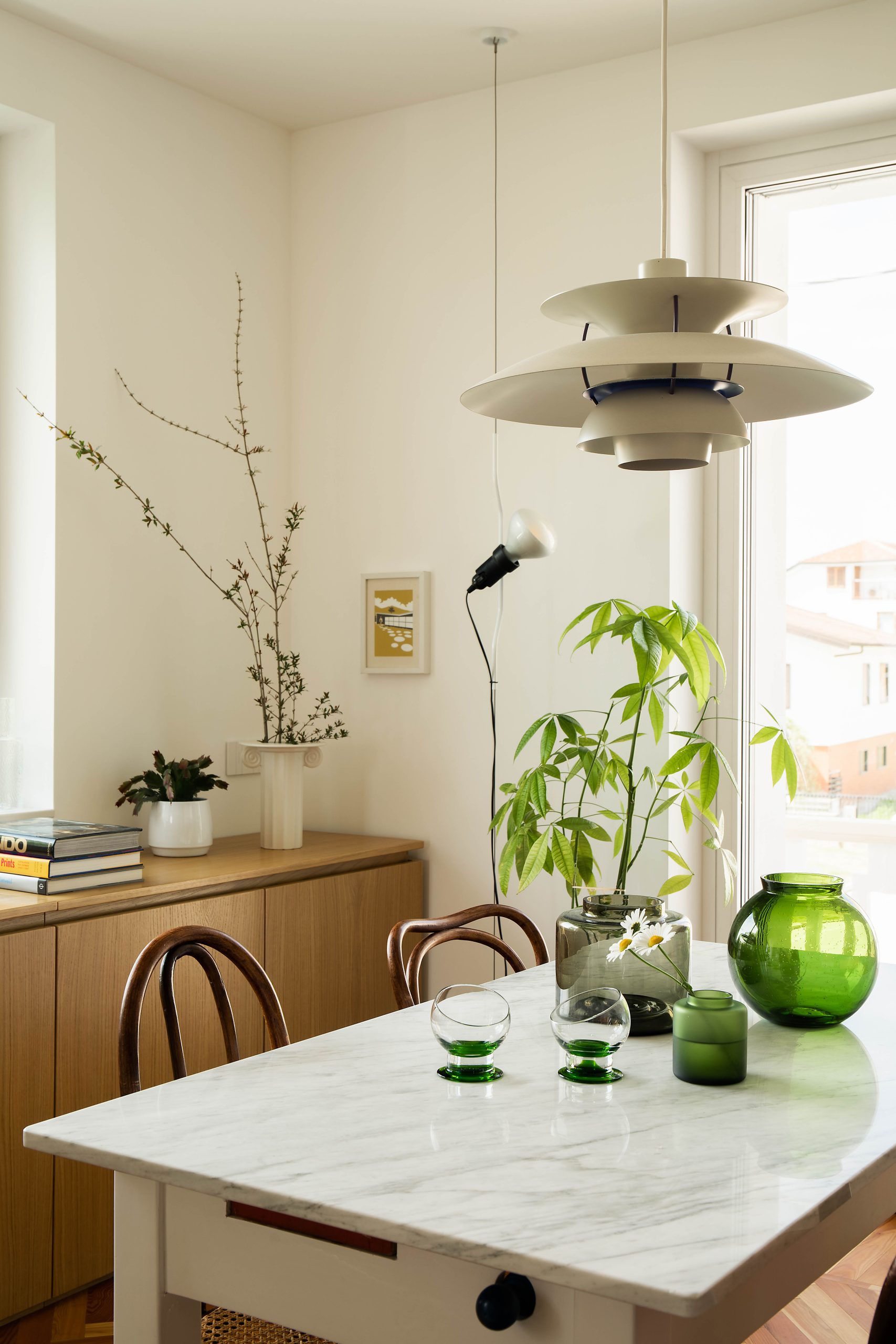 Lampade nere nel box-cucina: create su disegno - Tavolo vintage con piano in marmo Carrara - Sedie Thonet vintage - Sospensione area pranzo: PH 5 vintage, di Louis Poulsen - Lampada terra-soffitto: Parentesi, di Flos - Sedia a dondolo: Eames Plastic Armchair RE RAR, di Vitra - Lampada zona divano: Lamp de Marseille, di Nemo - La lampada zona tv: Fato, di Artemide - Lampada scrivania nel bow-window: Bilia Mini, di Fontana Arte