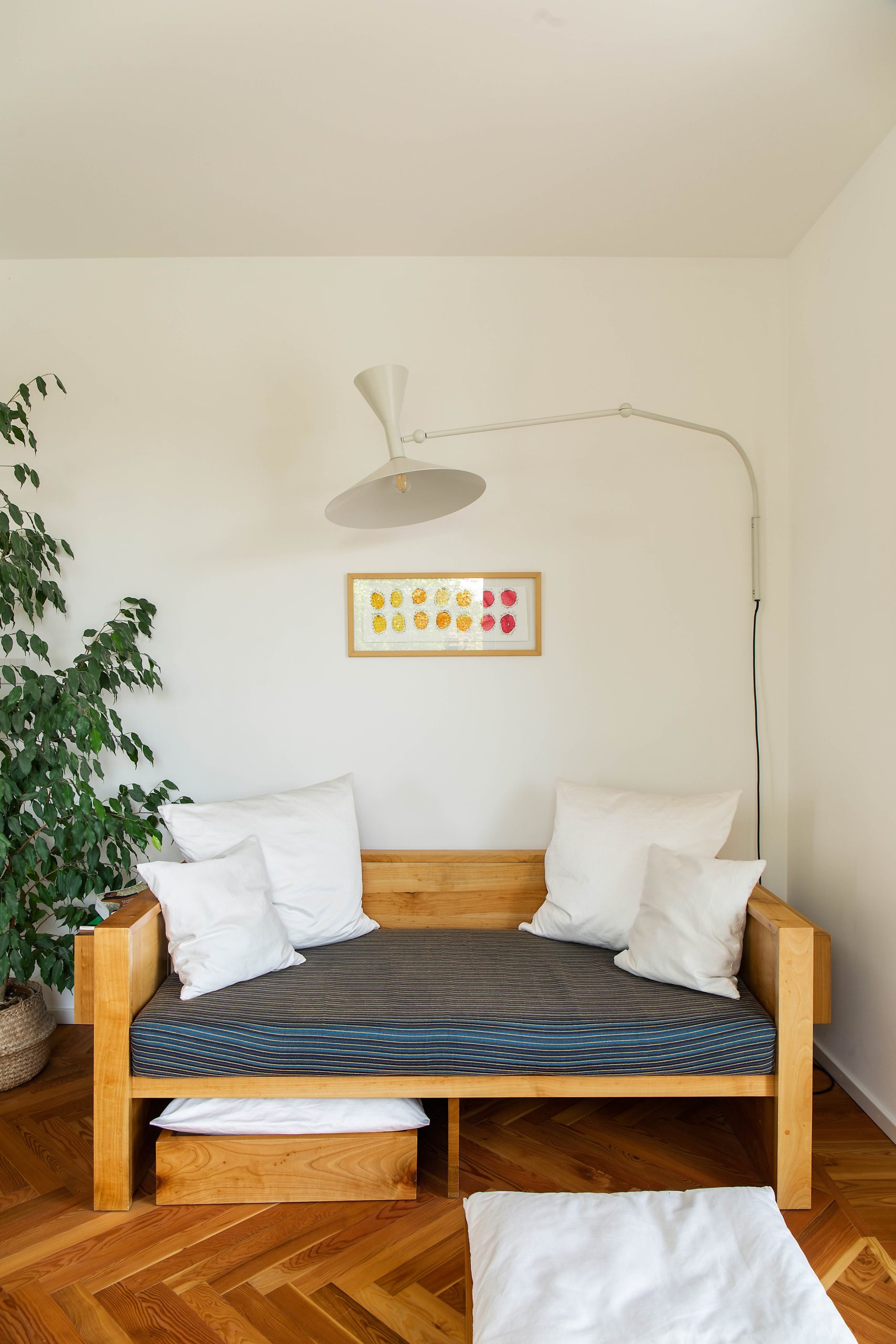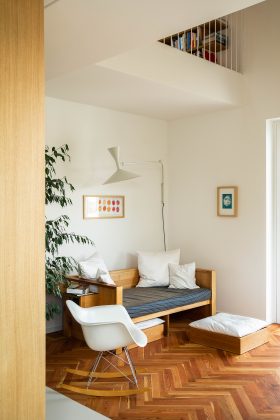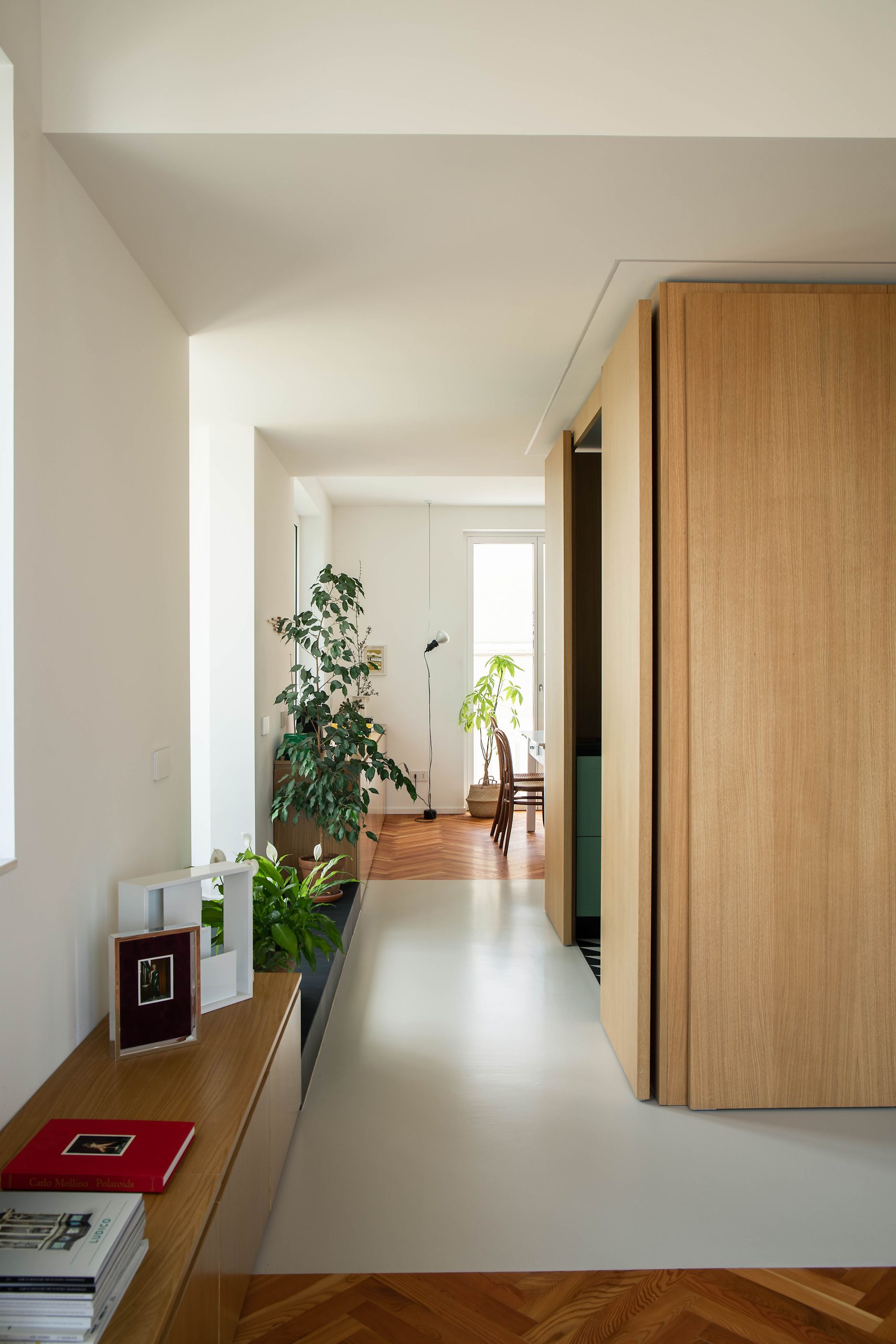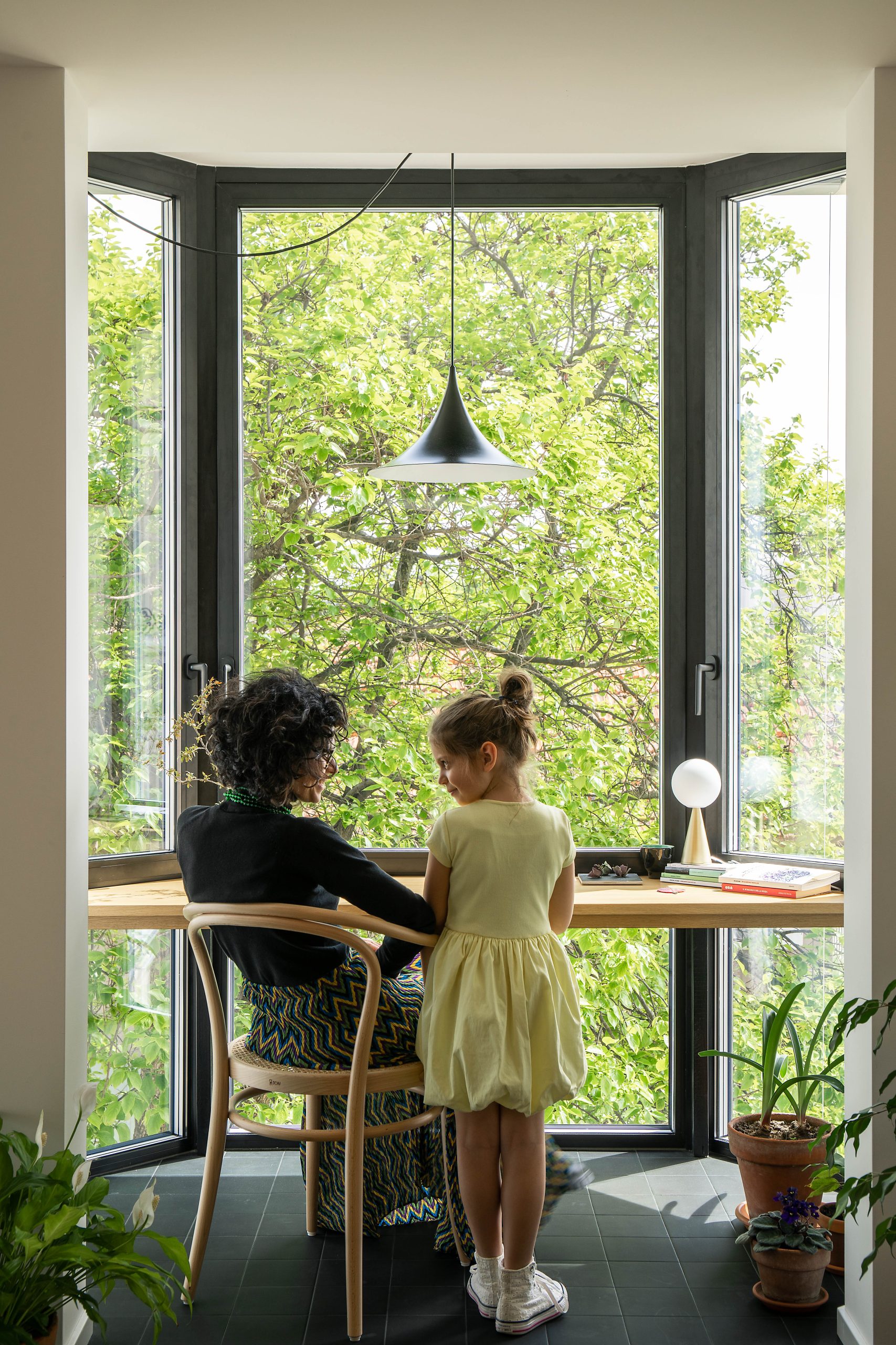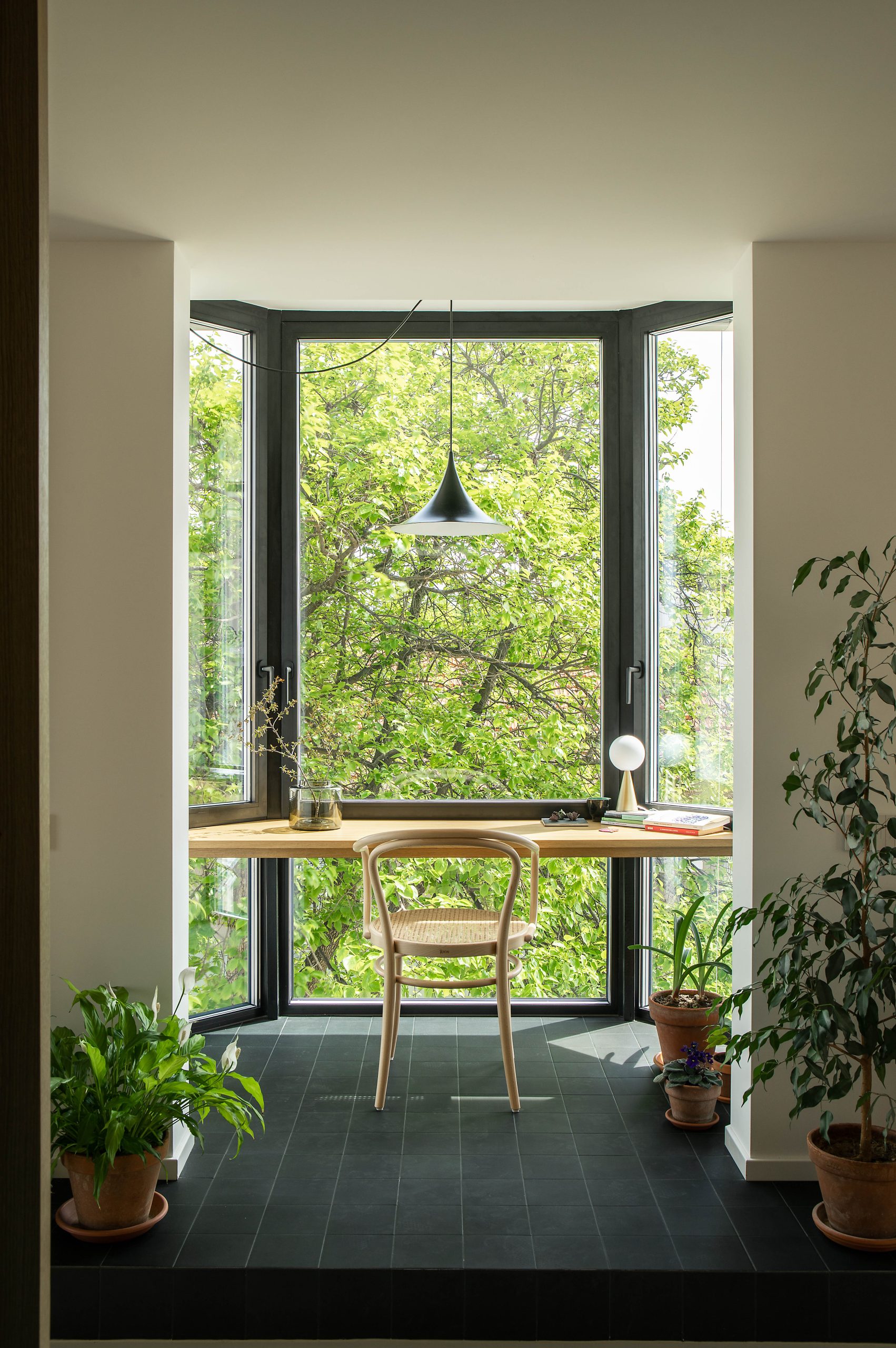 "Altro tema che ha guidato la ristrutturazione è la presenza del verde che si addentra nella casa attraverso le grandi finestre a sud e il bow-window (GALLERY QUI SOTTO) realizzato al posto di un balcone preesistente ed ora spazio contemplativo dentro al quale ci si sente come in una casetta sull’albero, completamente immersi nella chioma del grande albero di cachi che ne lambisce le vetrate. Uno spazio minimo che grazie ad un attento disegno dei dettagli ed una paziente cura nella scelta dei materiali, diventa un ambiente di grande valore a dispetto dei suoi pochissimi metri quadri".