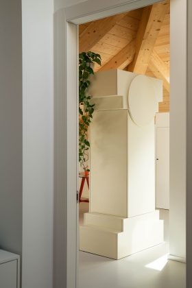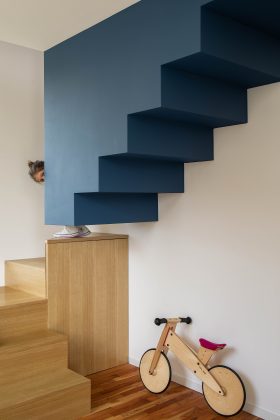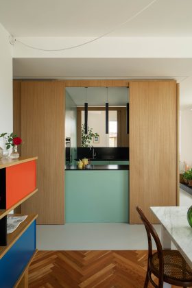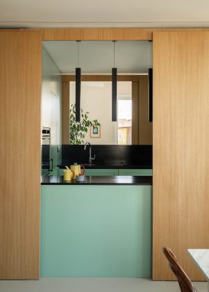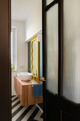 "La cucina e i bagni invece sono stati piastrellati con le medesime ceramiche posate però in modo diverso, così da da creare un differente gioco geometrico. I cromatismi pavimenti e cucina si ispirano a quelli delle cucine anni ’50, per enfatizzarne i rimandi".