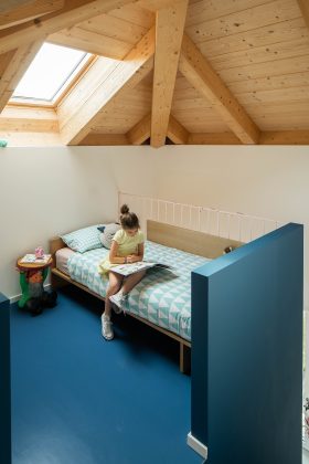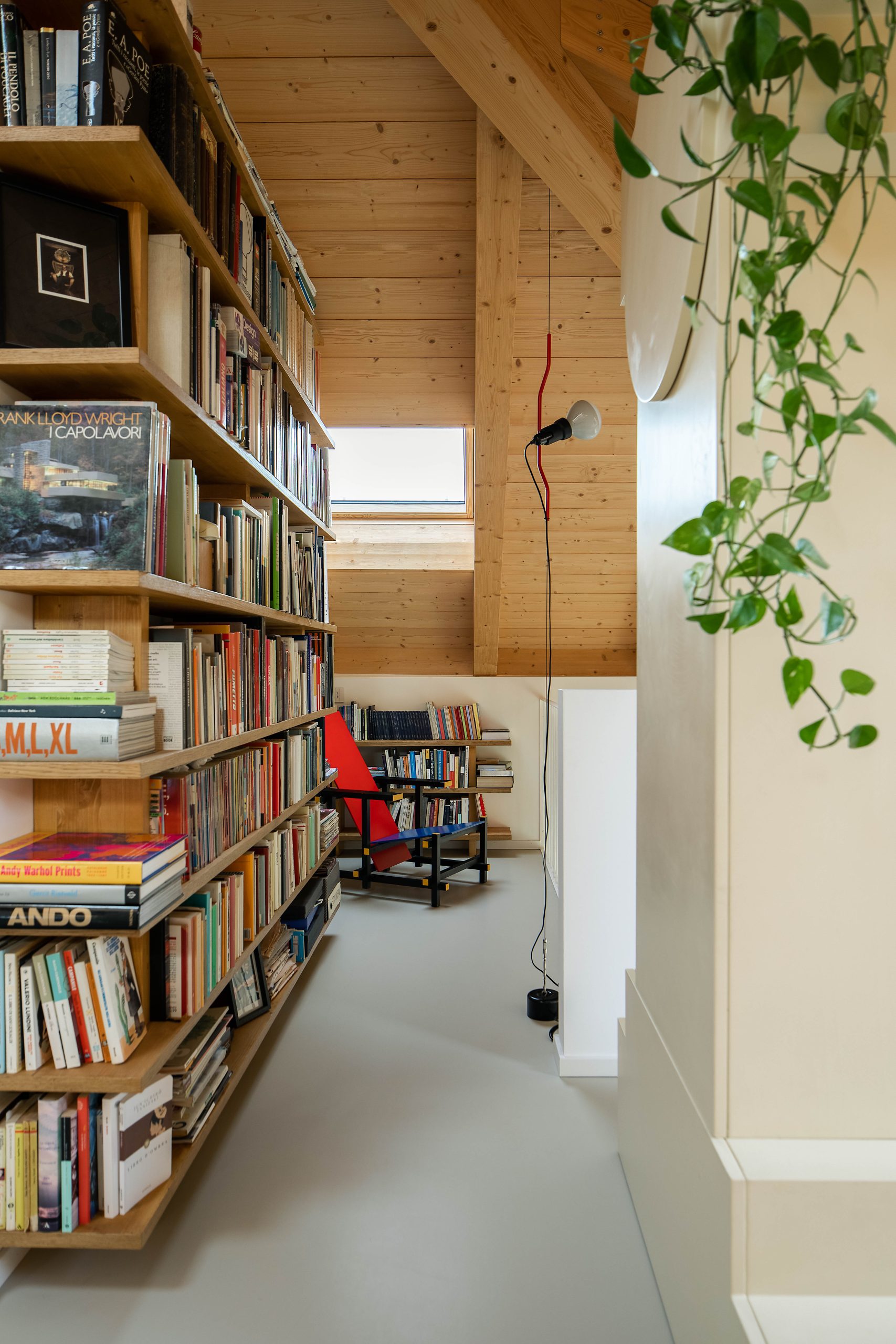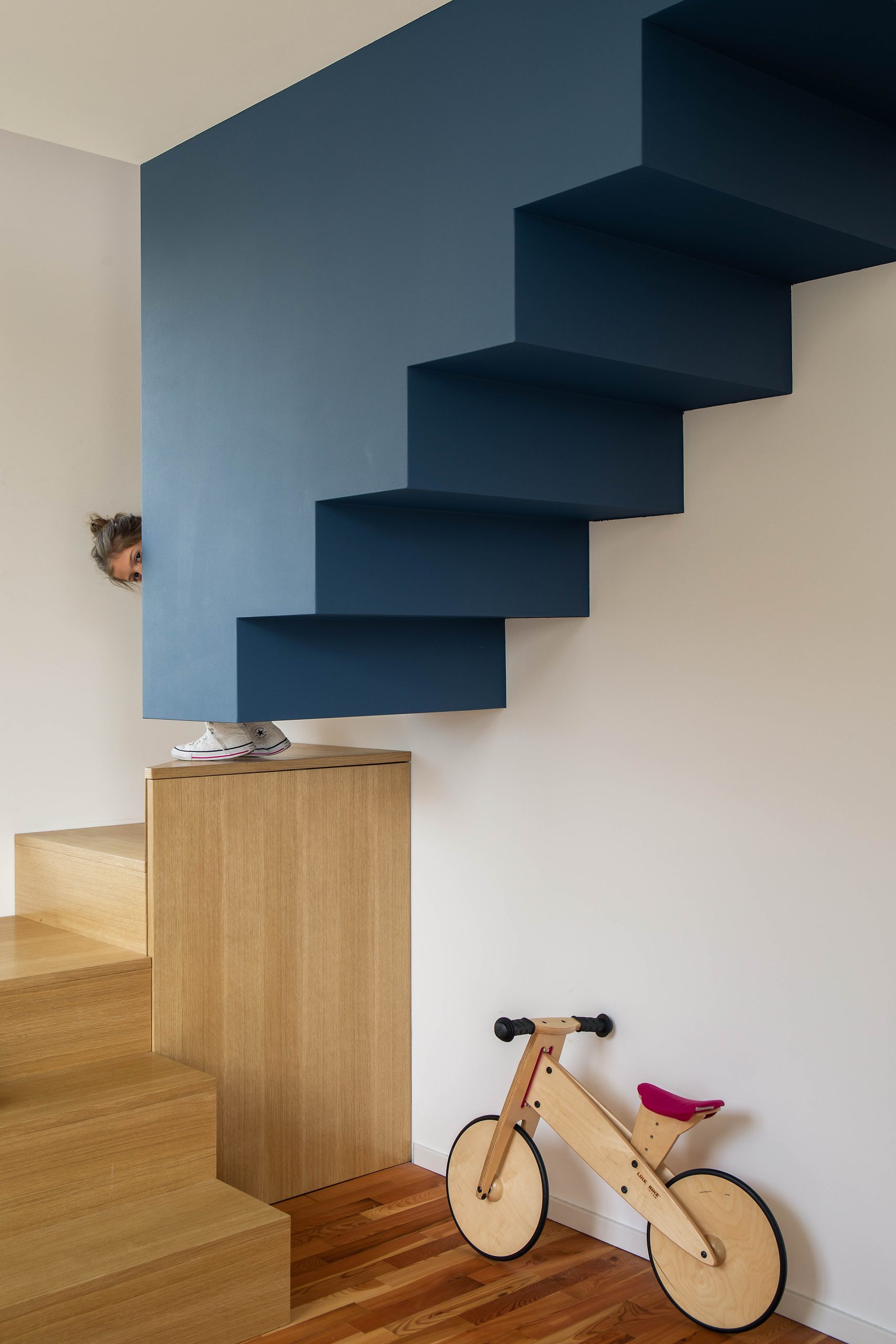 L'open space della zona giorno con la cucina si trova al primo piano della casa affacciandosi lungo il prospetto principale, aperto con due finestre e un bow-window centrale. Per capire come è stato sviluppato l'intero progetto, abbiamo chiesto all'architetto Bosio come fosse in origine la casa e, quindi, quale fosse l'idea generale per la ristrutturazione. "La casa era disabitata da molti anni ed era ricca di dettagli tipici della metà del secolo scorso e, così, abbiamo cominciato a ragionare su una possibile ristrutturazione che parlasse quel linguaggio. I lavori di ristrutturazione hanno coinvolto l’intera casa, compreso il recupero del sottotetto, e sono stati finalizzati a realizzare una distribuzione non convenzionale degli spazi", ha detto Claudio Bosio.