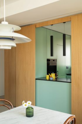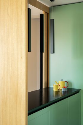 Frutto di un lavoro di "cesello progettuale" e fine opera di artigianato, il blocco contiene un piccolo mondo, una cucina mini ma completa, con basi e colonne realizzate su misura in laccato verde brillante, un colore vivido e gioioso come l'intero contesto. Ai mobili sono abbinati i piani di lavoro in granito Nero Assoluto, neri come le due lampade a sospensione create su disegno e come zoccoli, maniglie e gole. Tutti gli elettrodomestici sono di Franke.