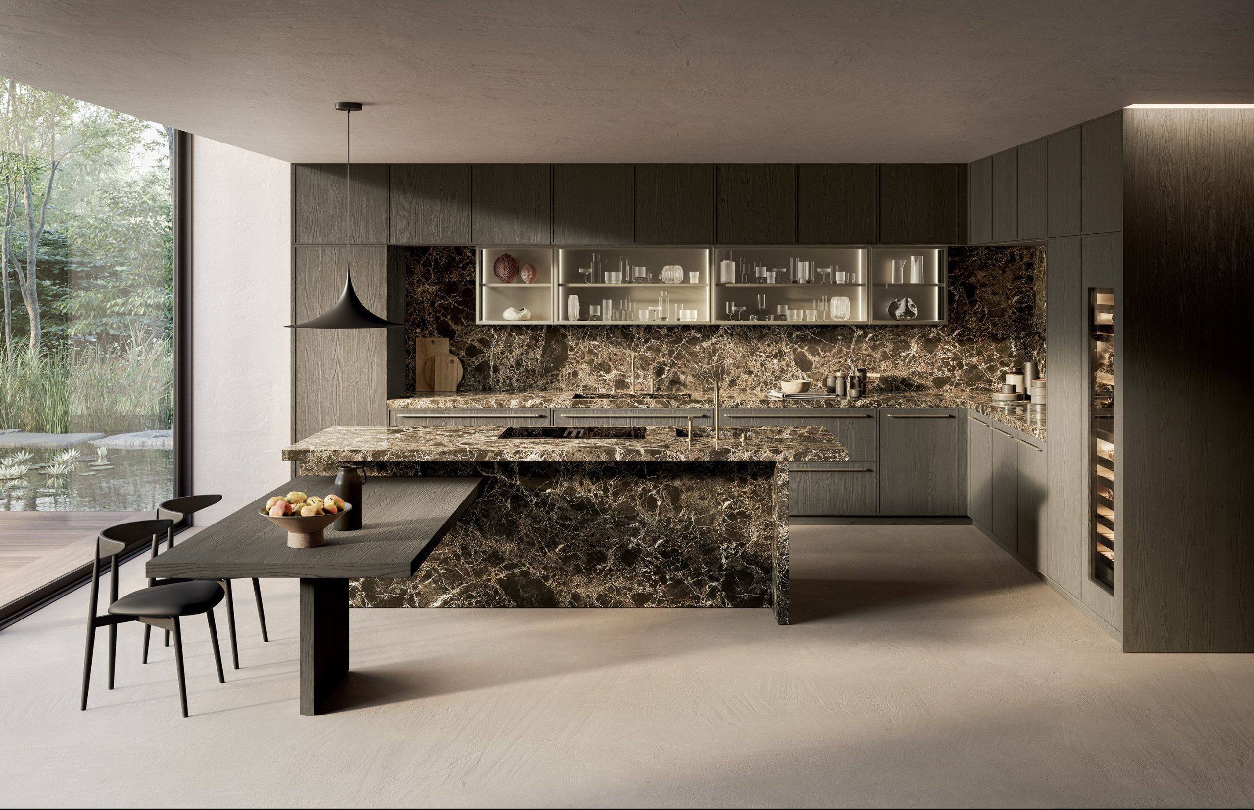 Margo in rovere sabbiato Piombo abbinata al prezioso marmo Emperador interpreta il progetto cucina come struttura architettonica. Un manifesto estetico che celebra il valore della materia naturale e la precisione dei dettagli, confermando l’identità Euromobil come interprete di una cucina contemporanea, solida e poetica.