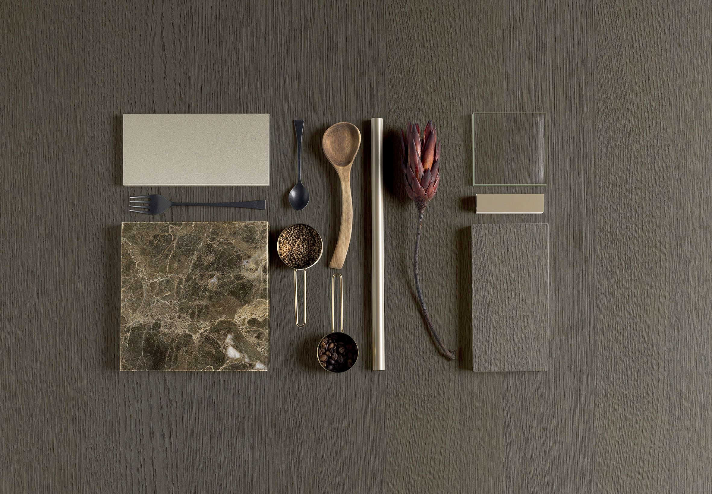 Nel nuovo progetto, la matericità intensa e le venature profonde del marmo Emperador lucido incontrano quindi il disegno delle ante a cornice sottile in rovere sabbiato Piombo. Il piano e i coprifianchi in marmo, spessi 60 mm e con lavello integrato, suggeriscono una visione elementi scultorea restituendo vibrazioni calda e sofisticata. Il marmo Emperador è infatti caratterizzato da un colore di fondo marrone con riflessi dorati, attraversato da venature chiare e da cristalli o salini bianchi, ideale per ambientazioni di lusso.