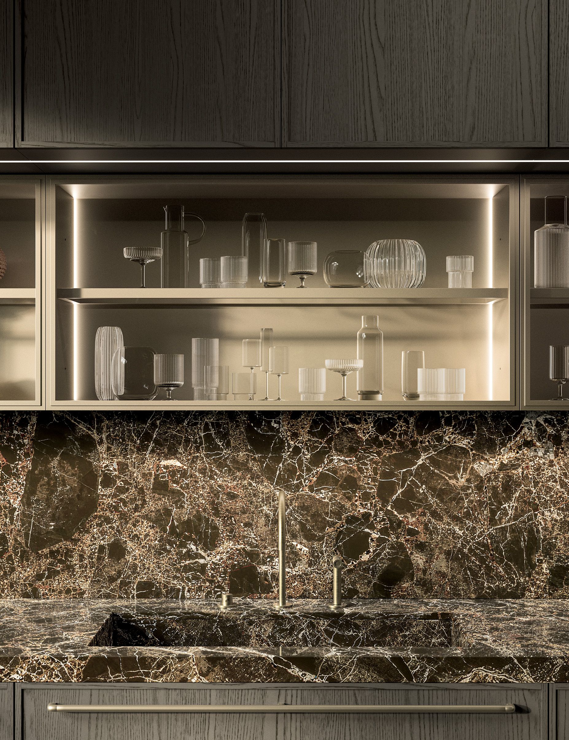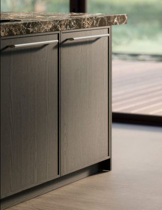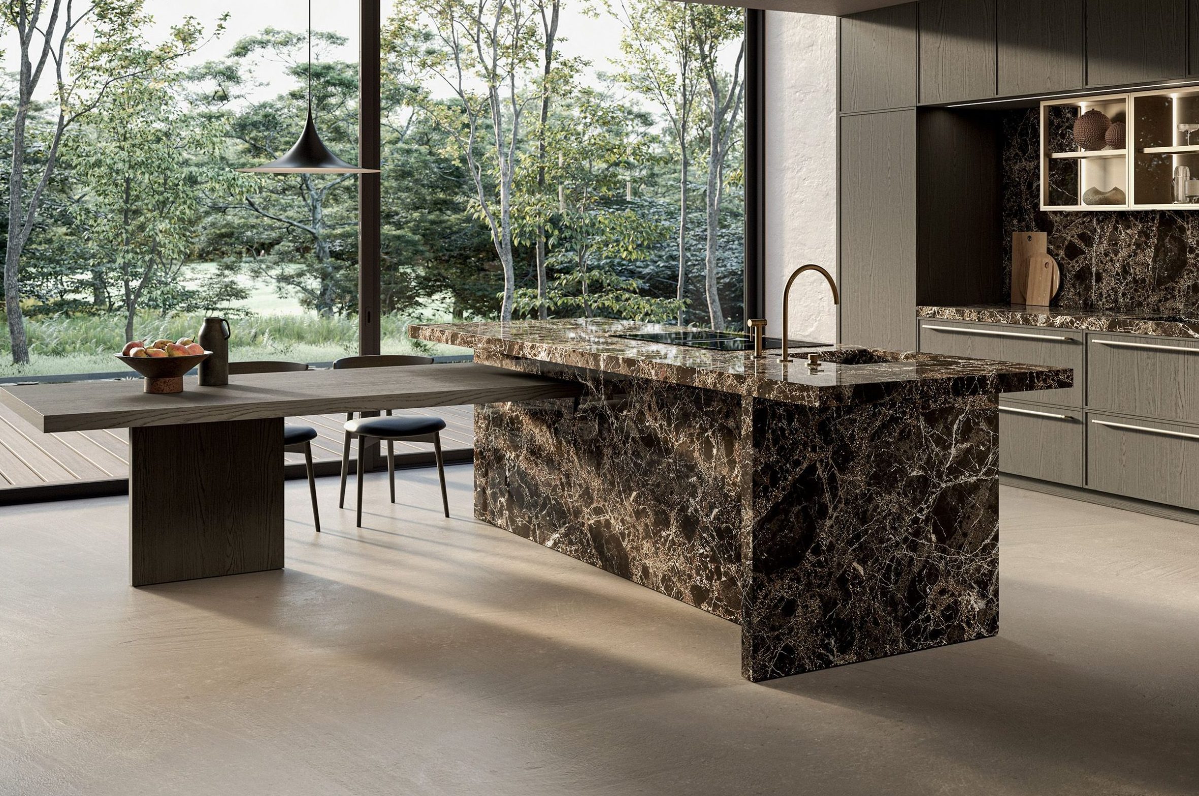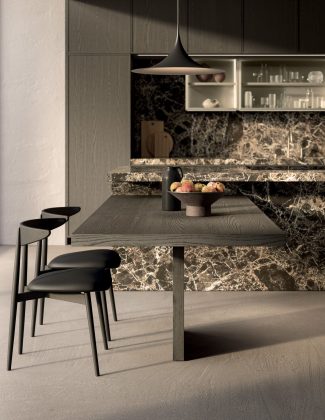 Nel nuovo progetto, la matericità intensa e le venature profonde del marmo Emperador lucido incontrano quindi il disegno delle ante a cornice sottile in rovere sabbiato Piombo. Il piano e i coprifianchi in marmo, spessi 60 mm e con lavello integrato, suggeriscono una visione elementi scultorea restituendo vibrazioni calda e sofisticata. Il marmo Emperador è infatti caratterizzato da un colore di fondo marrone con riflessi dorati, attraversato da venature chiare e da cristalli o salini bianchi, ideale per ambientazioni di lusso.