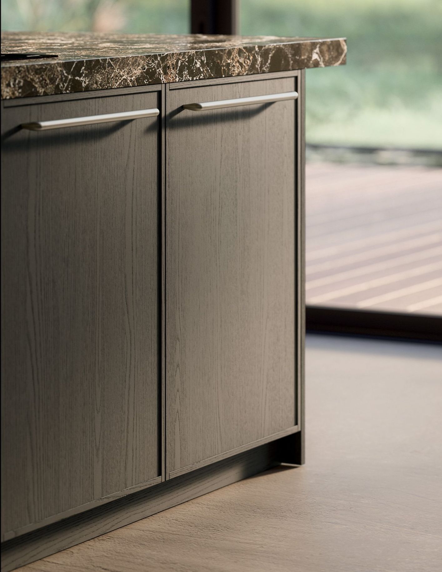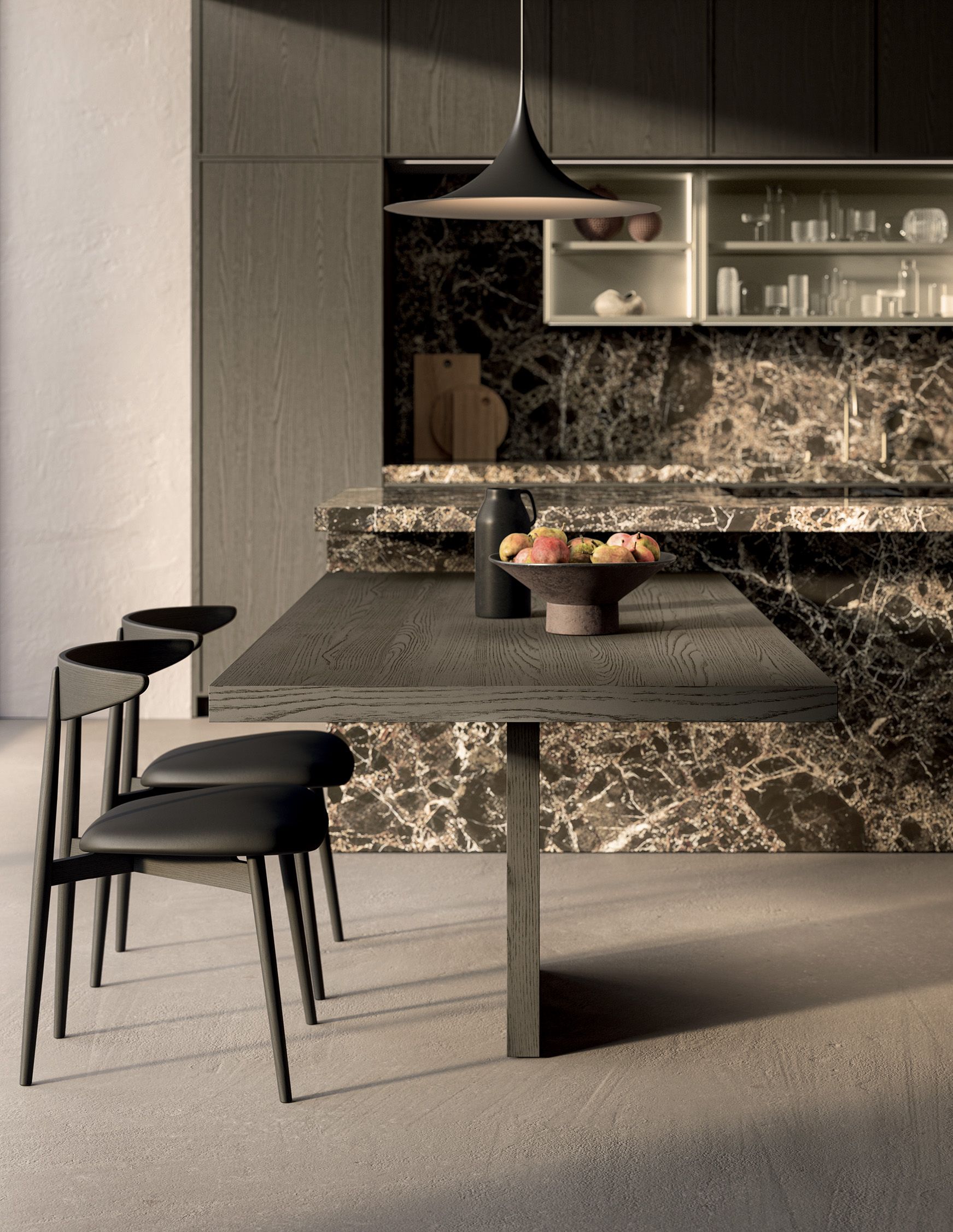 Margo in rovere sabbiato Piombo abbinata al prezioso marmo Emperador interpreta il progetto cucina come struttura architettonica. Un manifesto estetico che celebra il valore della materia naturale e la precisione dei dettagli, confermando l’identità Euromobil come interprete di una cucina contemporanea, solida e poetica.