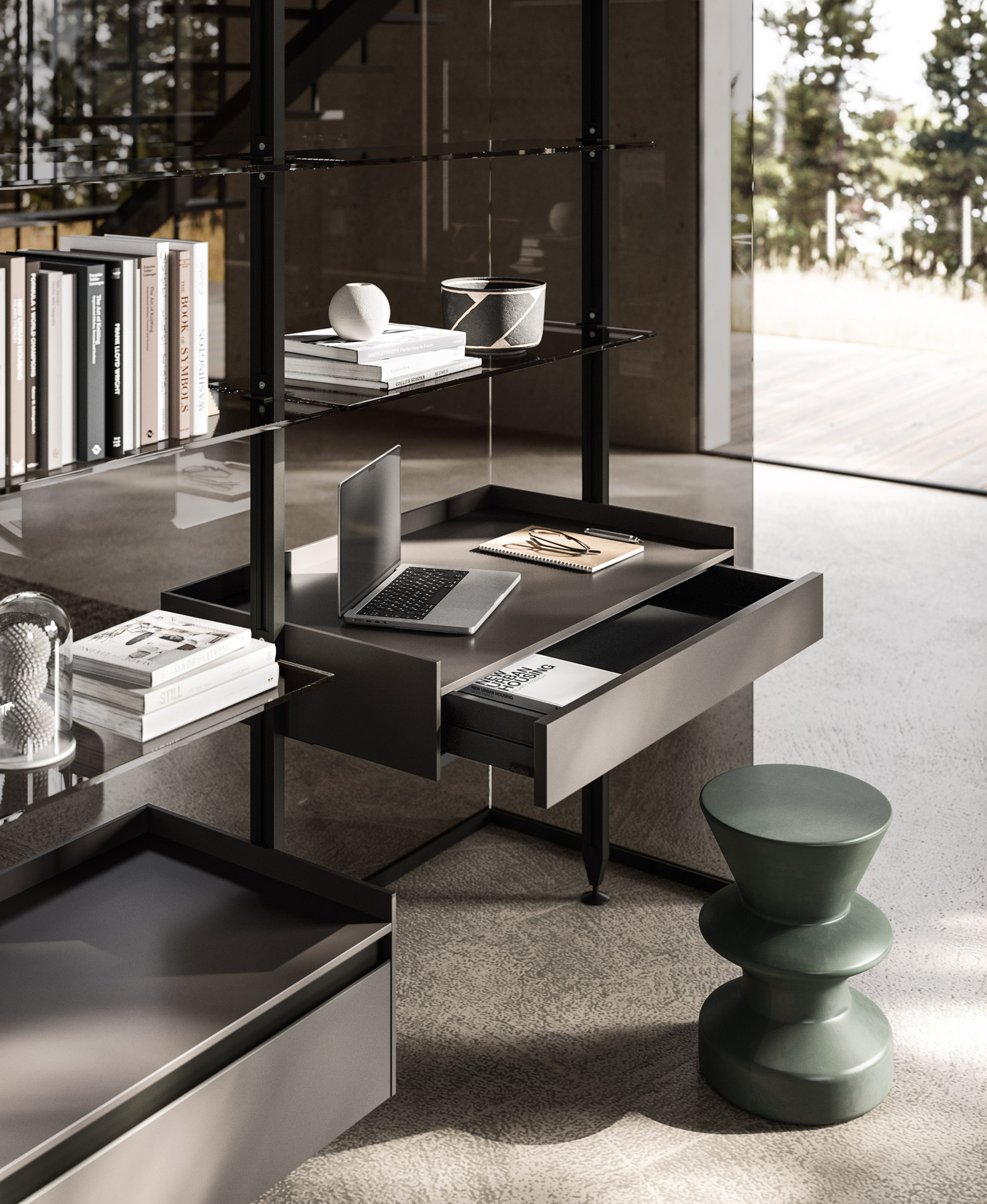 Libreria Vertical di Arrital: la struttura in alluminio Brunito si abbina a contenitori e ripiani in vetro fumè