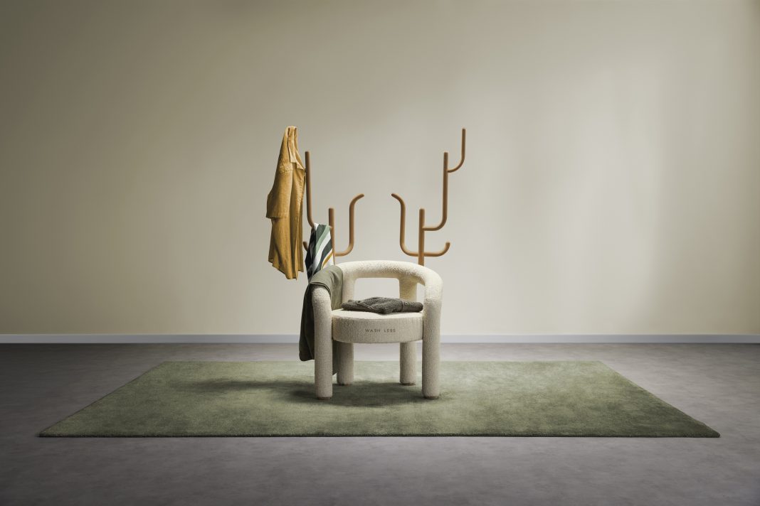 Questo progetto favorisce un processo naturale: indossare, arieggiare, re-indossare e infine lavare i capi solo quando è il momento giusto. Ciò permette di ridurre i lavaggi non necessari, risparmiando energia e acqua, prolungando la vita dei capi e riducendo gli sprechi. La poltrona stessa è un esempio di economia circolare, essendo rivestita in Ecoplen®, un innovativo tessuto autopulente realizzato con bottiglie in PET riciclato. Lo slogan “Wash Less” ricamato sulla seduta funge da promemoria del suo scopo di sostenibilità.